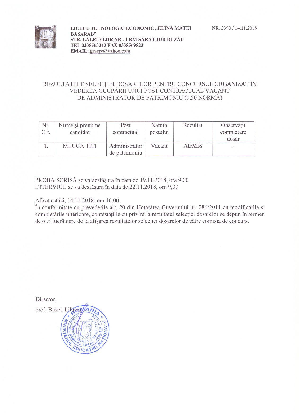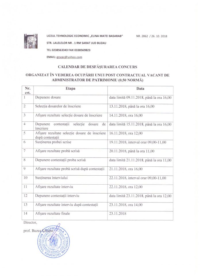 CONCURS Calendar desfășurare concurs ocupare post administrator de patrimoniu(0,5 norma) De către lictehec - 14 noiembrie 2018 0 925